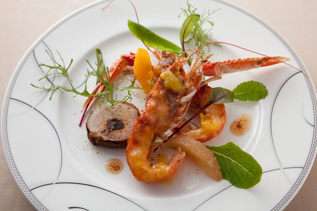 Grilled langoustine and duck pate with citrus hollandaise sauce prepared by Koh Kikuchi