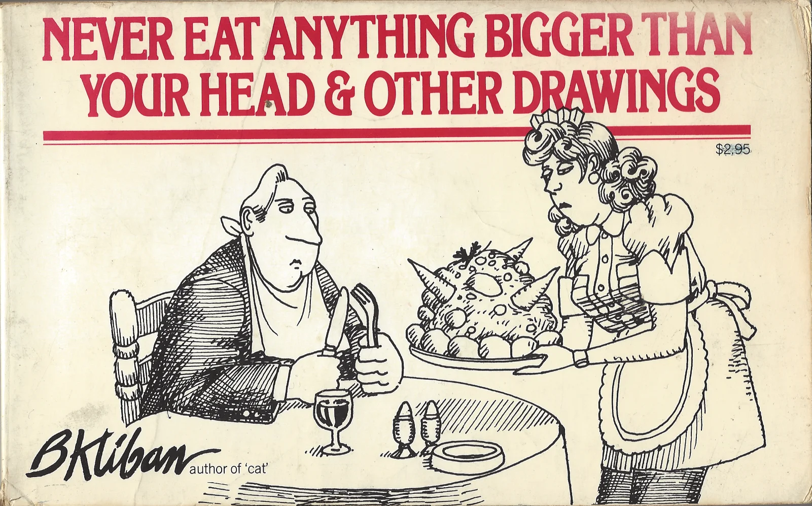 I first encountered B. Kliban’s Never Eat Anything Bigger Than Your Head & Other Drawings at my grandparent’s house in Poughkeepsie, New York. It was sitting there under a small stack of Reader’s Digest magazines. We were visiting for Easter, and I was bored and pouty after finishing dead last in the egg hunt. It was probably 1990, as I couldn’t have been much older than seven, but I distinctly remember flipping through pages of one-panel cartoons that featured grotesquely drawn humans, animals and food. I didn’t understand much of it, but still found the cartoons hilarious. They were comforting after such a humiliating loss.