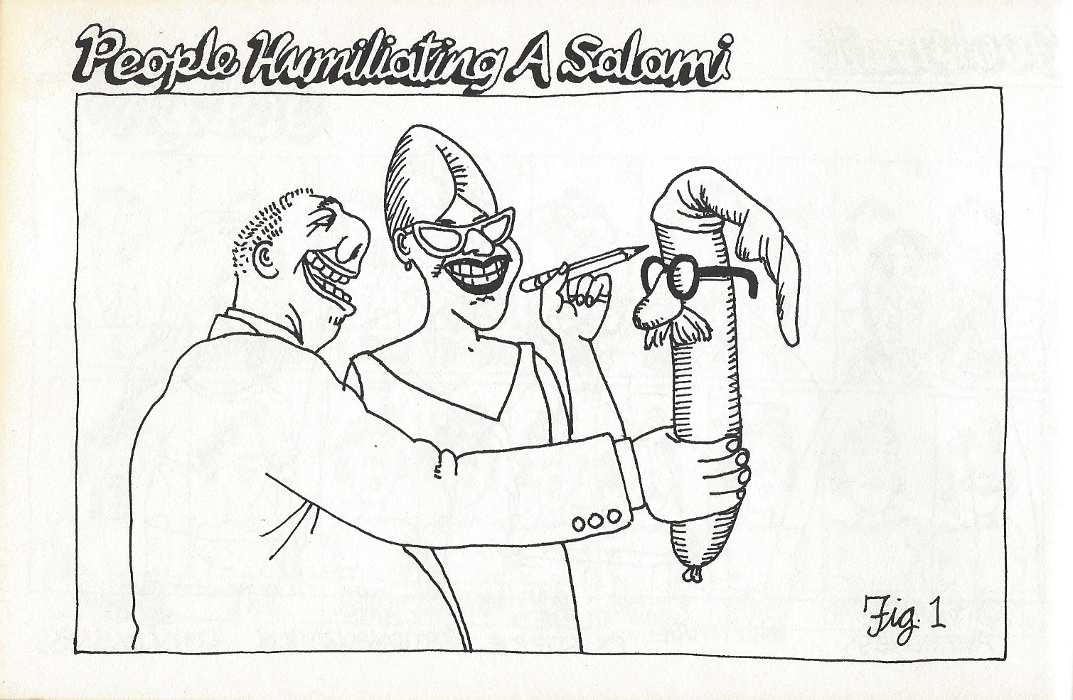I practically dance around the store and shove the book in my friends' faces. (They humor me; they are good people.) I slap two bucks on the counter for the book and a small coffee, and stand outside on the sidewalk flipping the pages. I start thinking about “People Humiliating a Salami.” What makes it so damn funny to me? I mean, sure, a salami is not something one normally humiliates since a salami doesn’t have feelings, so it’s funny, at least conceptually. But that doesn’t quite get at it; too clinical. Part of it could be that the word “salami” and a salami itself are just inherently funny (which is true, just admit it to yourself), but that still doesn’t describe the feeling. When I see those two people there, having such a great time harassing a defenseless salami, I simply lose it.