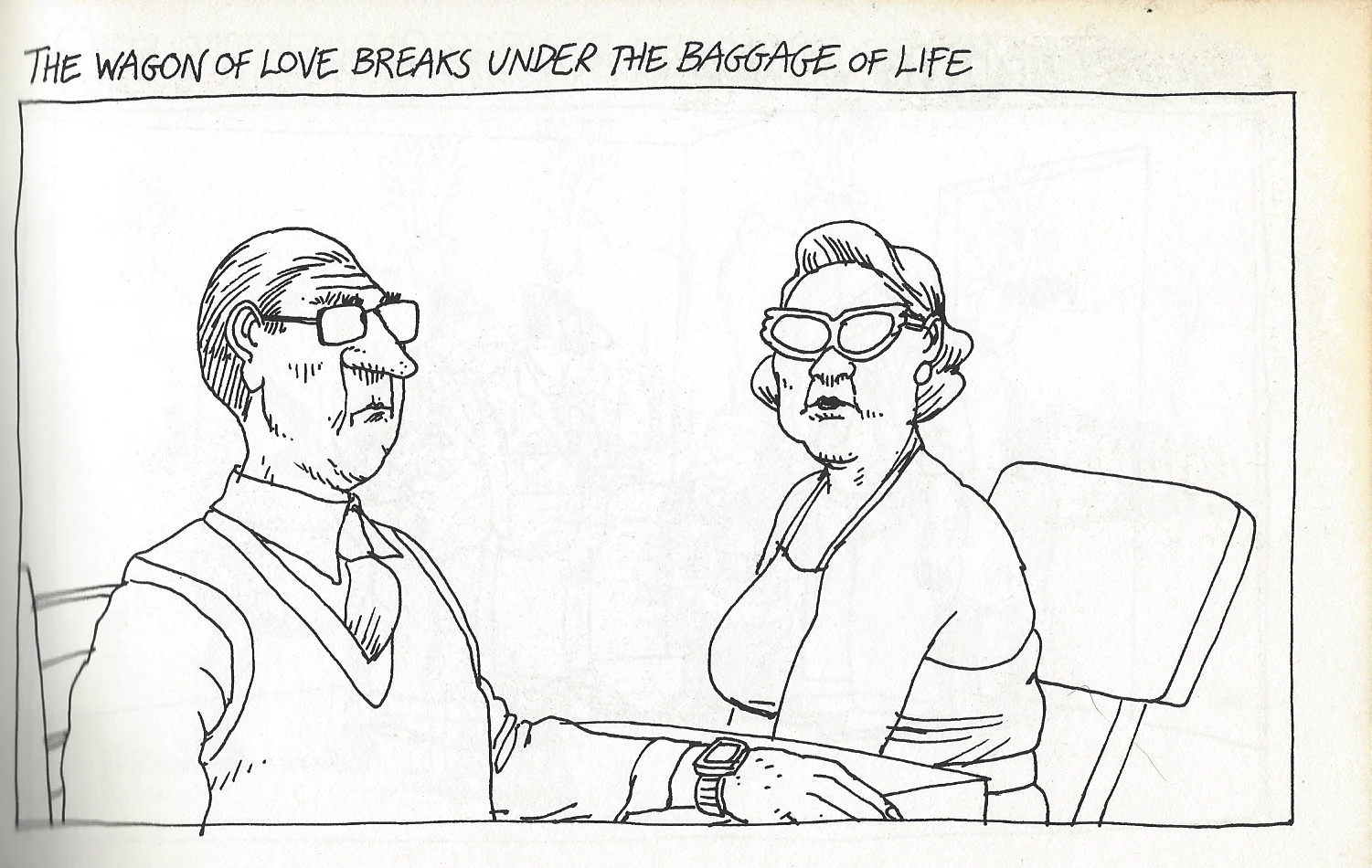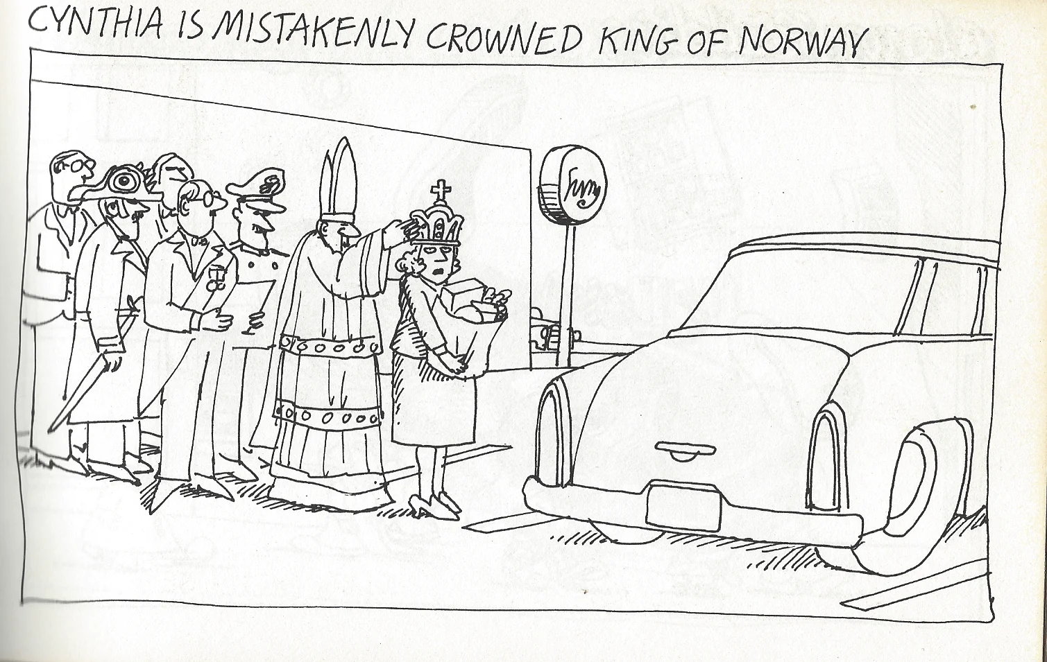 Of course, this isn’t to say that Kliban’s jokes are completely without thought or that he just sits around waiting for ideas to come, then immediately splashes those onto a page and sends them out for publication. Indeed, Kliban tries satire on for size, like in the panel titled “Nixon Monument,” which is a huge hole in the Earth, or the aforementioned cartoon of men falling out of a horse’s ass, which is entitled: “The Birth of Advertising.” These pieces help balance the book’s overall tone, since the more absurd cartoons have little to no context.